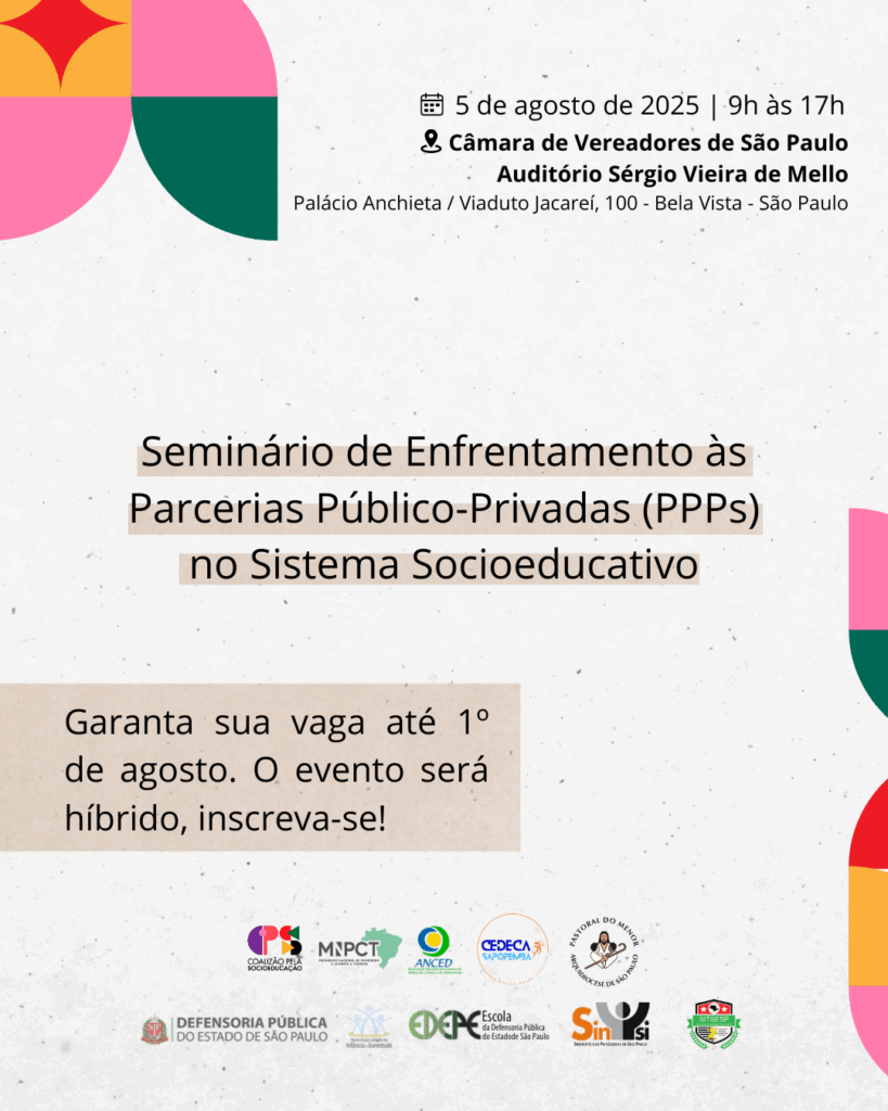 No próximo dia 5 de agosto, a Coalizão pela Socioeducação realiza o Seminário Contra as PPPs no Sistema Socioeducativo, um encontro nacional que reúne especialistas, defensoras(es), organizações da sociedade civil, movimentos sociais e trabalhadoras(es) da área para debater os riscos e impactos da privatização no campo da socioeducação. O evento será gratuito, híbrido e com certificação para as pessoas inscritas.